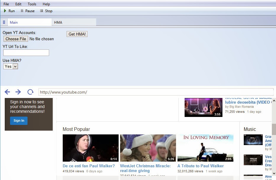 Load your YT accounts in format "username,passsword" insert the url you want to gain subscribers on then hit run! It will go through each account and load the inserted video then click subscribe and repeat.
